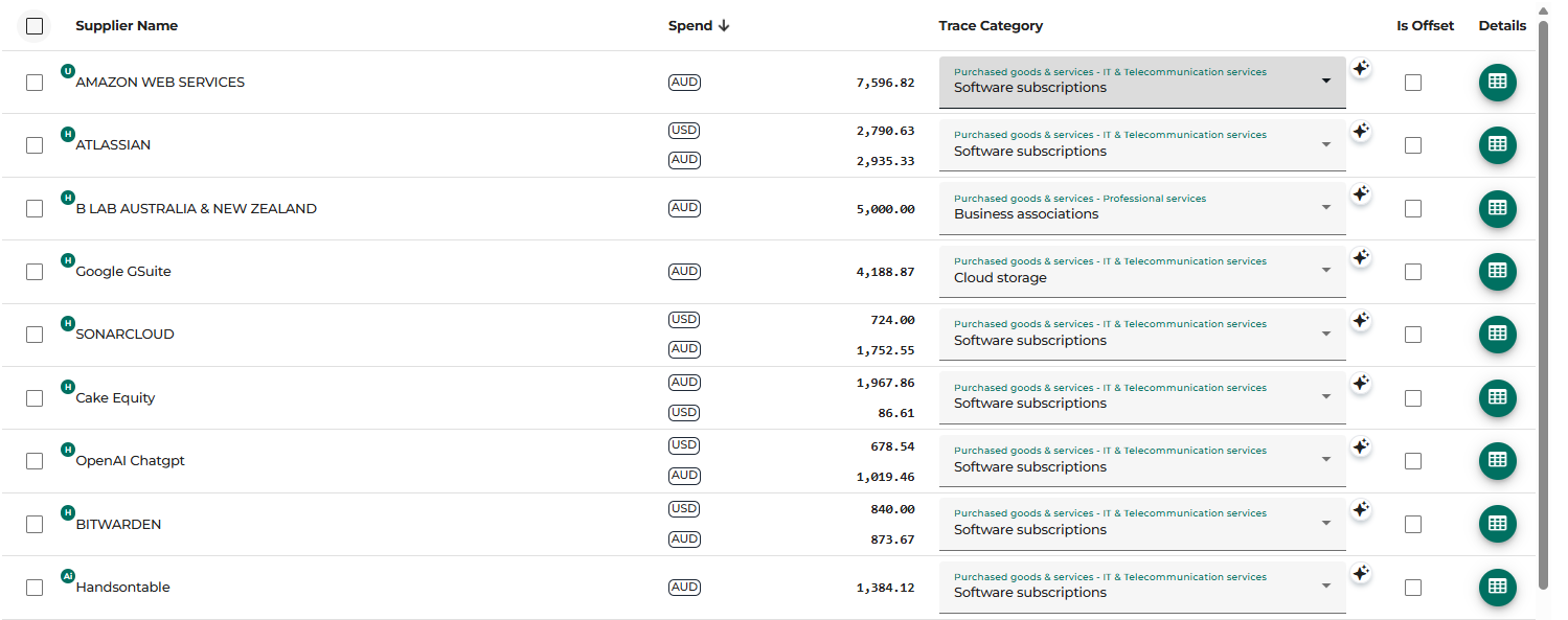 Transaction level mapping allows you to map individual transactions within a single supplier expense line, rather than applying one emissions category to the total spend. This is useful when a supplier provides multiple types of services, for example separating cloud services and advertising across multiple invoices from the same supplier. This feature is available on selected plans only. To access transaction level mapping, click the green spreadsheet icon on the right of the expense line. To activate this feature, contact the Trace support team.